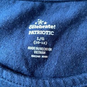 Navy blue with red, white & blue print on the front. Worn once for Fourth of July, LIKE-NEW condition.