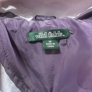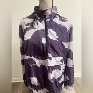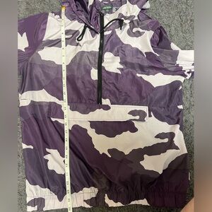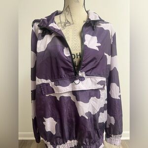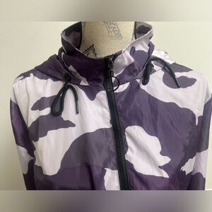Really cute zip-up windbreaker from target by Wild Fable. The jacket is a dark purple camo print and a drawstring around the collar and functional zipper on the front. In good used condition with some minor issues. There are no large flaws but there are some use signs like the small stains seen in photos fabric piling loose threads etc (see all photos please)
