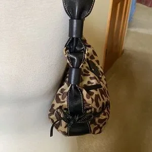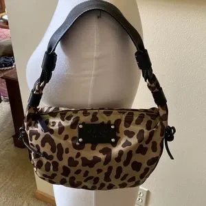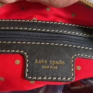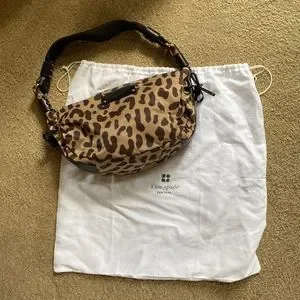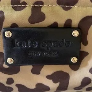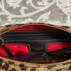 Kate Spade like new (used once) mini gabi camel giraffe print purse. Fabric with black leather trim. 3 pockets on inside - 1 zips, 2 open pouches. 2 1/2” wide leather strap with details on side. Lining is red fabric with gold polka dots. Gold hardware. 11.5” W, 7” H, 4” D, 8” strap drop. Dust bag included. It’s a Classic!