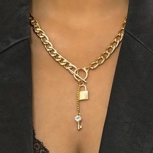 Up for your consideration is this beautiful LOCK AND KEY gold tone fashion necklace featuring a toggle closure with crystal embellishments