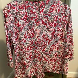 Beautiful paisley top!!! EUC. Red with gray colors, a hint of peach. Front has tie knot. Size Med. Keyhole in back. Banana Republic.