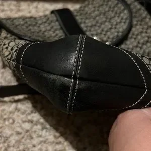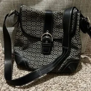 Preowned Crossbody bag by Coach. Black leather and signature C canvas. Snap closure with additional pocket on the outside. 2 spaces inside with zipper compartment, 2 internal open pockets and a clip for keys. Measures approximately 11.25” x 10.75” x 2”. Drop in handle 21” with 2 more holes up and 1 down- spaced 1” apart.