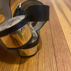 These sandals are in excellent like new condition. Size 8 black leather. Worn maybe twice. Gold heels are perfect for dressing up or down