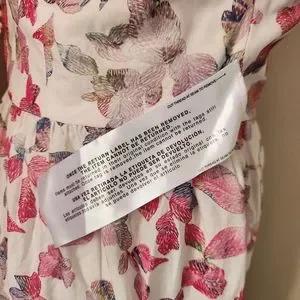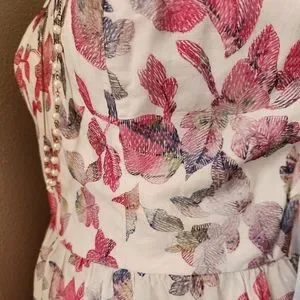 The material has beautiful pink, purple, green and blue flowers embroidered on a white background. Fully lined underneath. Zipper back. Ties on the arms to adjust the height of the shoulder.