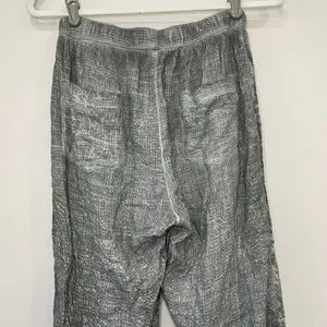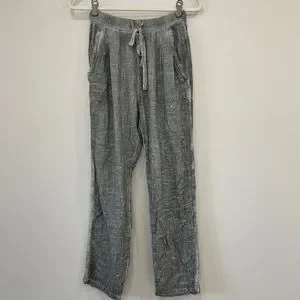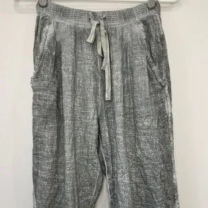 Fringe side lounge pants, stretchy waist band with strings, high waisted, terry cloth material, size S. Lay flat waist 12.5”, rise 12”, inseem 27.5”, length approx 37”. Tiny imperfection - last pic. Care and material tags are missing.
