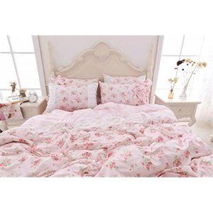 Floral Rose Print Duvet Cover Set Light Pink Lace Ruffle Floral Shabby Chic NWT