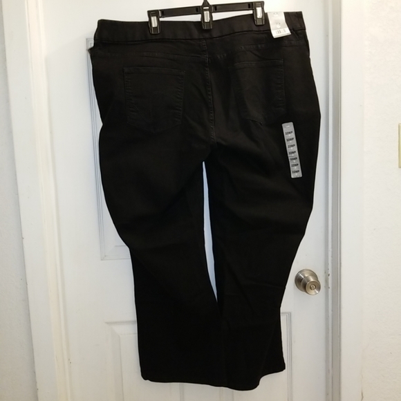 Lee black cotton/poly/spandex denim-like fabric, platinum label, midrise, barely bootcut, pull-on styling (no fly), NWT, this is a PETITE length.