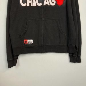 Disney Store Chicago Skyline Mickey Mouse Silhouette Full Zip Black Red Gray Unisex Hoodie Size L. Chicago appliqued felt graphic with red felt mickey mouse head and gray Chicago city scape behind him. 90% cotton, 10% polyester. Machine wash, tumble dry. In great, pre-owned condition with very light wash wear. Measurements taken flat: pit to pit: 24.5", sleeve length: 28.5", shoulder to hem length: 27.5". Style # 711140482.
