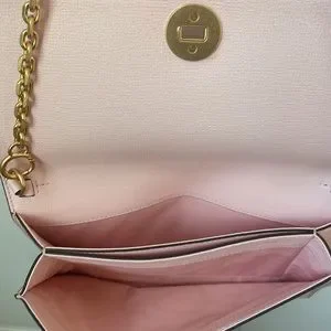 Clutch pink leather. Gold toned hardware and chain shoulder strap. Turn lock closure at front. Used for two events.