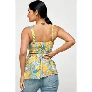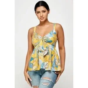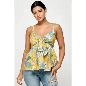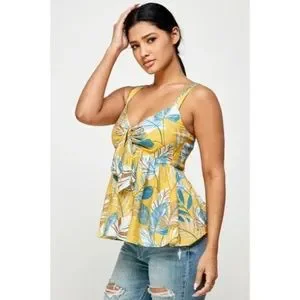 Honey Yellow Blue Tropical Floral Knotted Cami Babydoll Summer Vacation Tank Top