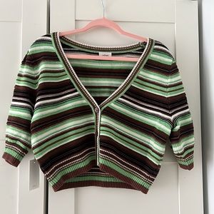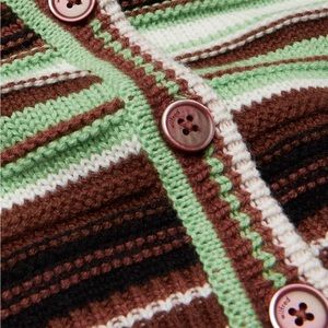 This is a V-neck cardigan with a front button placket and short puff sleeves. It’s knit with an extra-fine merino wool-cotton blend that’s lightweight and super soft against your skin. This version comes in an earthy stripe pattern.