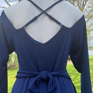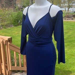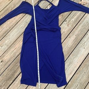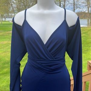 This blue dress has a low V-neck and cold shoulder styling. Wrap it completely around you to pull in your waistline. Or tie it in the front if you want to wear it as a pregnancy dress. Both images are shown. Lots of stretch. Sexy, soft and stylish.