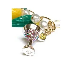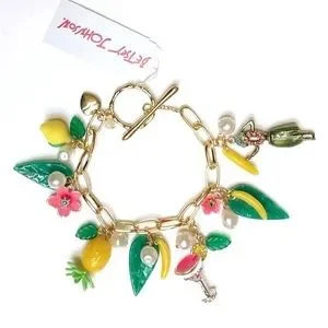 Refined chain link bracelet featuring mixed tropical island charms including hula girl, festive drink, lustrous pearls, flowers and fruit. Charms are adorned with glistening stones.