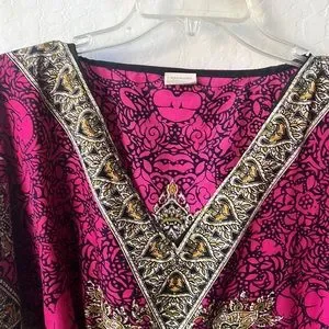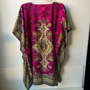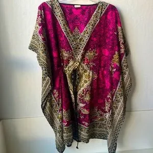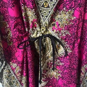 Swimsuit cover up with a cinch waste. This has paisley floral design. Super comfortable to lounge around in. Material