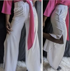 Cropped top off shoulder bustier top, with High waist belted wide leg half split pants.