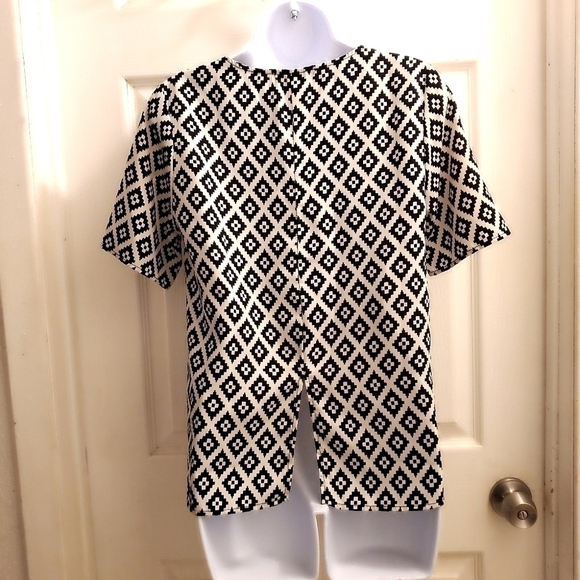 Everly short-sleeved blouse. Slight scoop neck, straight hem with split in back. No damage, defects or flaws that I can see. Pit to pit measurement is shown in pic #5, shoulder seam to hem measurement is in pic # 6 and length of split on lower back is shown in pic # 7.