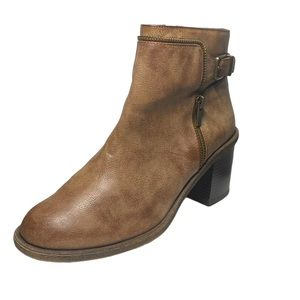 Gianni Bini Brown Ankle Boots. Two Sided Zip (faux zip on one side) Buckle Belt Ankle Shoes. Stacked Heel approximately 3”.