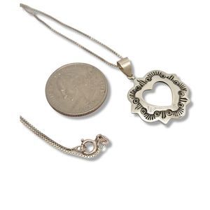 Vintage Organically Antiqued Tyrolean Style Silver Heart Pendant 18" In New condition. Open Box Link 1mm Chain. Spring Ring Clasp. Approx. Measurements 1 1/4"H x 1"W x 18" chain length.