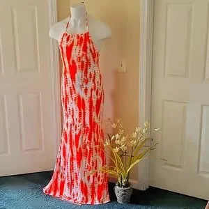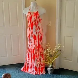 Beautiful Orange and White Strappy backout Maxi Dress. Criss Cross Tie up in the back. Size L. 65% Polyester, 35% Cotton. Absolutely Georgeous on. Super Sexy and Sophisticated! PTP 17" The dress is very flattering and has stretch to accent your figure!