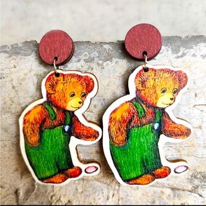 These adorable lightweight wooden earrings feature the lovable teddy bear in green overalls looking for his lost button from Don Freeman’s delightful “ Corduroy ” Books. They are predominantly brown and green.