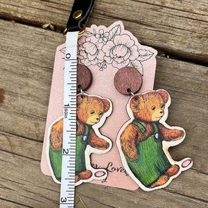 Unique, fun, teacher earrings, book character, read, literary, literacy, bear, teddy bear, green overalls, corduroy, pencil, writing, art, art class, kindergarten, preschool, elementary school, funny, cute, artsy, hilarious, will get lots of compliments, wood, wooden, hypoallergenic, sparkle glitter studs, girly, humor, principal, counselor, director, school, nature