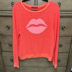 WildFox soft, lightweight orange women's sweater, size medium. Coral with pink lips. This sweater has long sleeves, a rounded neckline, and the Wildfox signature soft-pilly textured knit.