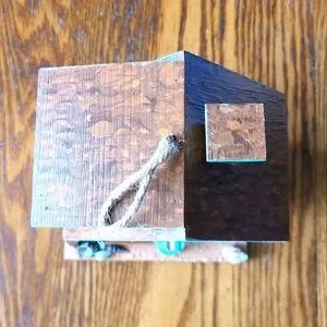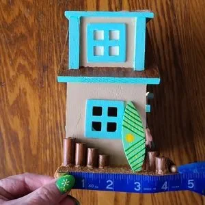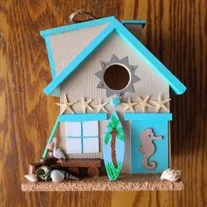 🐦🏖 HANDPAINTED👙🤿 Wooden Patriotic Birdie Beach House. Brilliant colors. Handmade surf board and sand. 🥰 And check out the sail boat just waiting to be taken out for a cruise!