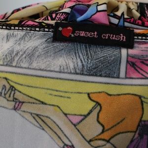 Stretch tight fitting pop art blouse, size S with capped sleeves and side ruching.