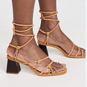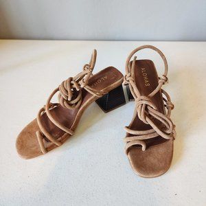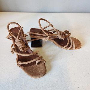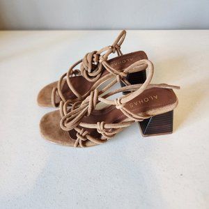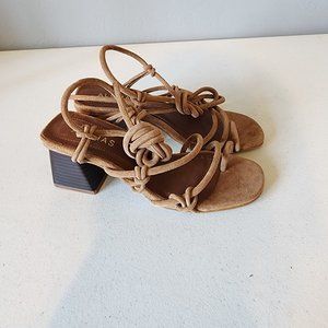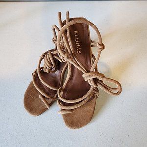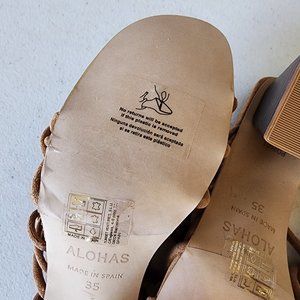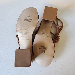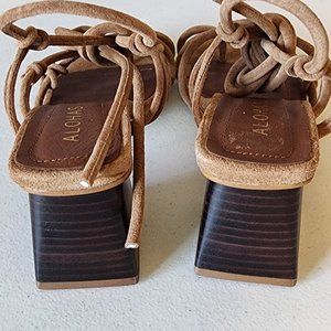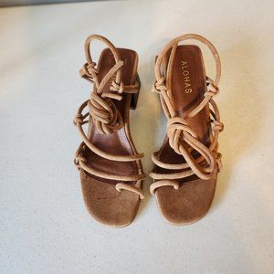 "NEW" Gorgeous Looking Brown Suede/Leather Sandals By Alohas. Toe Ring Style with Ankle Wrap Straps, All Leather Uppers & Lining, Cushioned Foot Bed, Stacked 2.1/4" Square Heel, Man Made Soles, Made in Spain, New, Never Worn, Only Tried On:) Rt.180.00 approx. Size 35 / US 5-6. Runs Large, Foot Bed Measures 9" for Reference. They Say to Size Down On Sandals:)