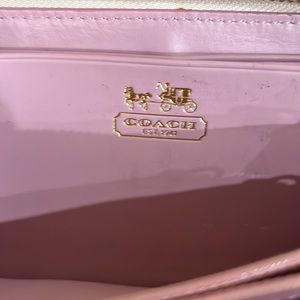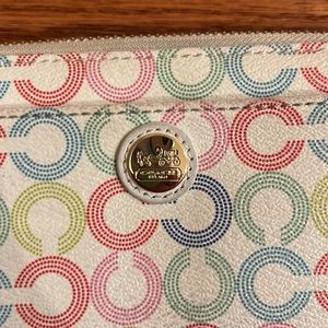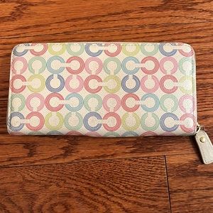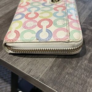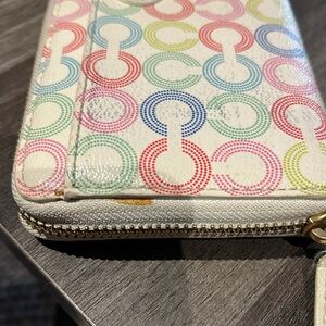 Very pretty coach leather wallet. Beautiful colors for spring. Visible signs of wear in form of some staining. Might be washable with some TLC. No odor. No rips. Zippers work like new.