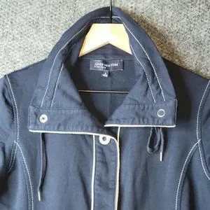 Jones New York Navy Blue and White Jacket Coat Women Size S; high drawstring collar, 2 front pockets