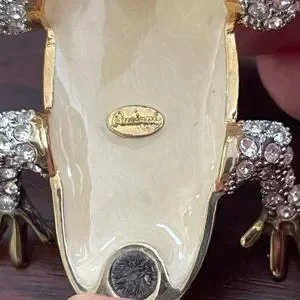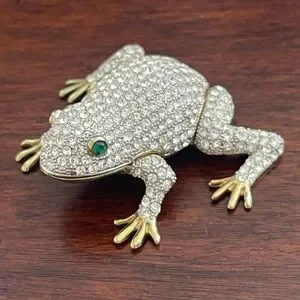 This is an absolutely gorgeous large signed Rucinni pave set Swarovski crystal diamanté enamel metal frog pill box / trinket box / jewelry box. It measures 2.50 inches long and 3.0 inches wide. The eyes are made of green Swarovski crystal. It is beautifully enameled on the inside. Stamped Rucinni inside the box. Opens and closes with a magnetic hinge. In excellent vintage condition.