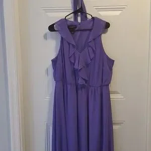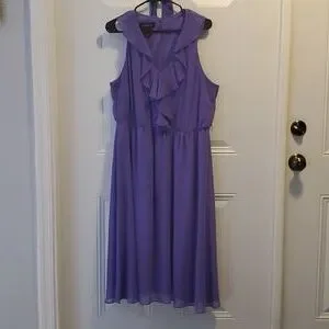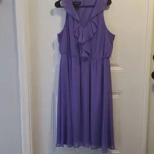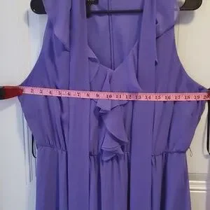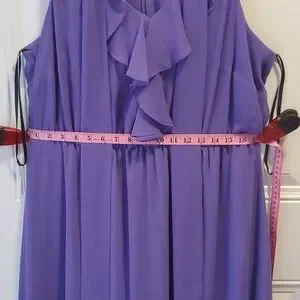 Lane Bryant size 18 dress.100 % polyester.It has ruffles below the neckline.The matching waist line tie and it has the loops on the sides.The length is 47 inches long from shoulder.35 inches long from armpit.Bust is 20 and waist is 18 with an elastic band.This dress is gently used and comes from a smoke free house.