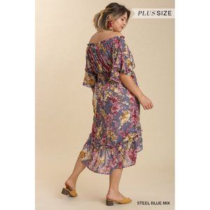 Umgee Plus Steel Blue Mix Sheer Floral Print Off Shoulder Ruffle Hem Midi Dress