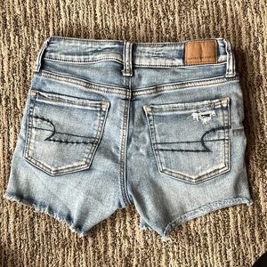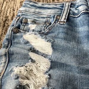 American Eagle Jean Shorts, ne(x)t level stretch, midi, distressed, lace appliqué on pockets, EUC.