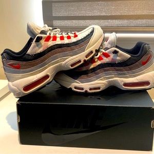 Nike Air Max 95 “Sakura”. Inspired by Japanese cherry blossoms, this pair opts for a canvas and suede construction, in clean tones of grey, white, black and red. Japanese inspired prints can also be seen throughout the shoe! Men’s size 11.5 comes with OG box.