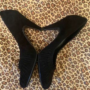 Soft faux velvet on the outer sole. Cute Pleated look to the front of the shoes. Inner sole has some cracking and peeling that does not take away from the flawless condition of the outer sole. 3 1/2”
