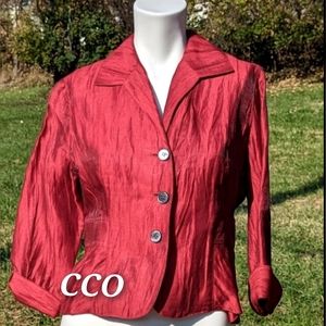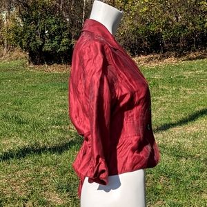 Red muted crepe tie back button down shirt. ¾ cuffed sleeves. This top is gorgeous. It's hard to do it justice in the pictures. New condition. No flaws, marks, holes or snags. 85% linen. 14% nylon. Chest 38". Sleeves 16". Waist 32". Length 20".