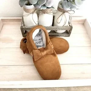 Monkey Feet Brown Bow, size 5-6 Y. Brand new never used, with inner fur lining to keep your child’s feet warm.