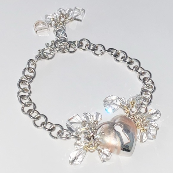 AUTH VTG Christian Dior Silver Chain Link Crystal Bead Heart Lock Charm Bracelet