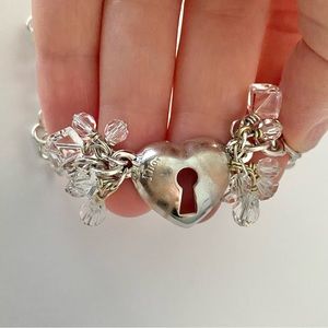 Authentic Vintage Christian Dior Silver Chain Link Bracelet with Silver Heart Lock And Crystal Beads.
