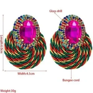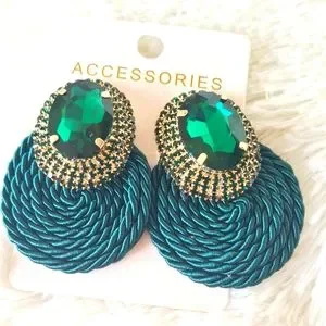 Big Rhinestone and Cord Earrings, Green/Emerald colour