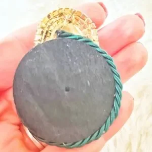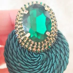 The big Emerald green glass Rhinestone is surrounded by several tiny ones and accompanied by Emerald green cord string.