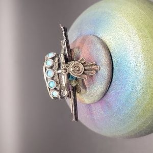 Intriguing opal Hamsa ring in a size 7. Sterling silver with a dangling Hamsa protection charm. The ring has five vibrant opals and is oxidized. Beautiful and comfortable. I just never seem to wear it as much as it should be worn.