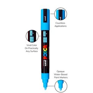 The PC-5M's versatile bullet tip offers unlimited freedom of use and adapts to all types of creation. POSCA markers are mixable and layerable, the water-soluble, non-toxic ink dries quickly and can be used on a variety of surfaces.