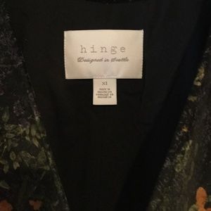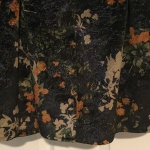Beautifully soft velvet feel jacket with dark floral print and open front (no buttons). Self-fabric ties at wrists, back vent and pleats.