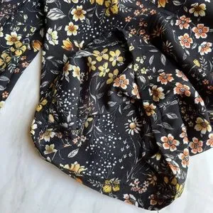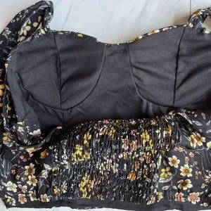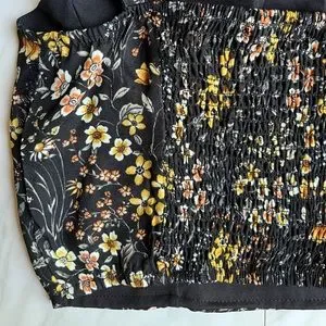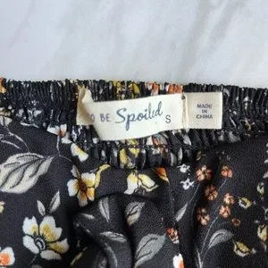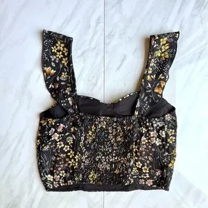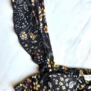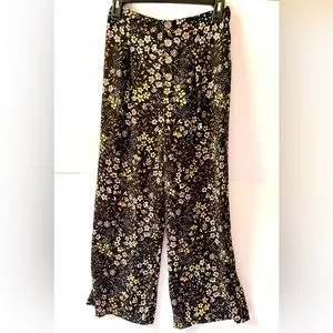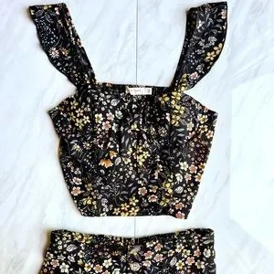 This two piece set contains a cropped tank top and flowy pants. The top includes a padded bra. The pants have an elastic waistband and are ankle length. Only worn once and in like new condition.