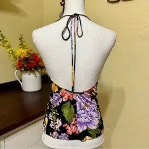Beautiful vibrant print, soft viscose material, halter tie, open back.