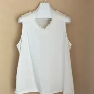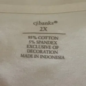 2 Piece Bundle CJ Banks Size 2X Women’s Tops. One top I’d cream and one is white. The cream one has lace on the top front. Both are in great shape. The cream one is made of 95% cotton and 5% spandex. The white one is made of 100% cotton.