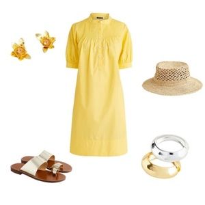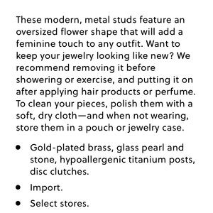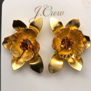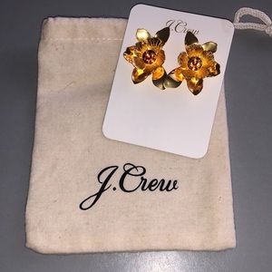 J. Crew Burnished Gold Earrings with an oversized floral design and a glass stone in the center. These earrings are a modern look yet still feminine. NOTE: The last three photos show “how to wear.” Jewelry pouch is included.